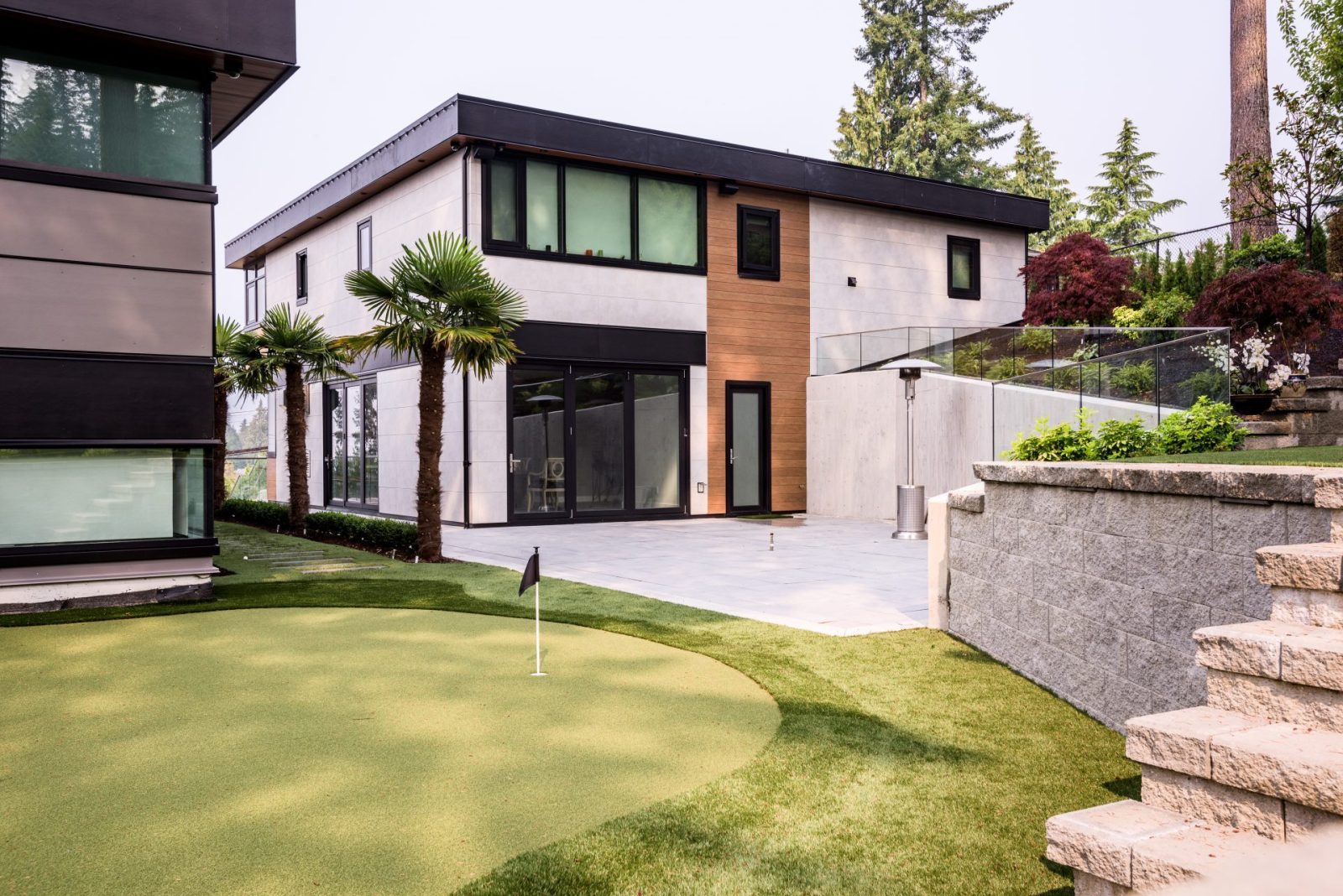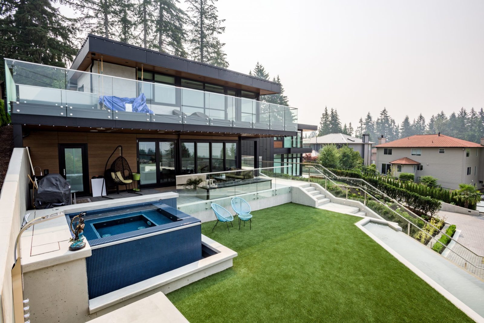 Each of these contemporary homes is approximately 6,500 square feet. Spread over three levels, they feature expansive curtain walls, architectural concrete, open floor-plans and premier finishes. The houses boast four bedrooms, six bathrooms, a grand kitchen with butler’s pantry, hydraulic elevator, media room, sauna, in-ground hot tub, exercise room, and three-season patio connected to the main entertaining area with sliding glass wall, as well as home automation and an emergency generator. The scope of work included the design, demolition and civil services, as well as construction and project management.