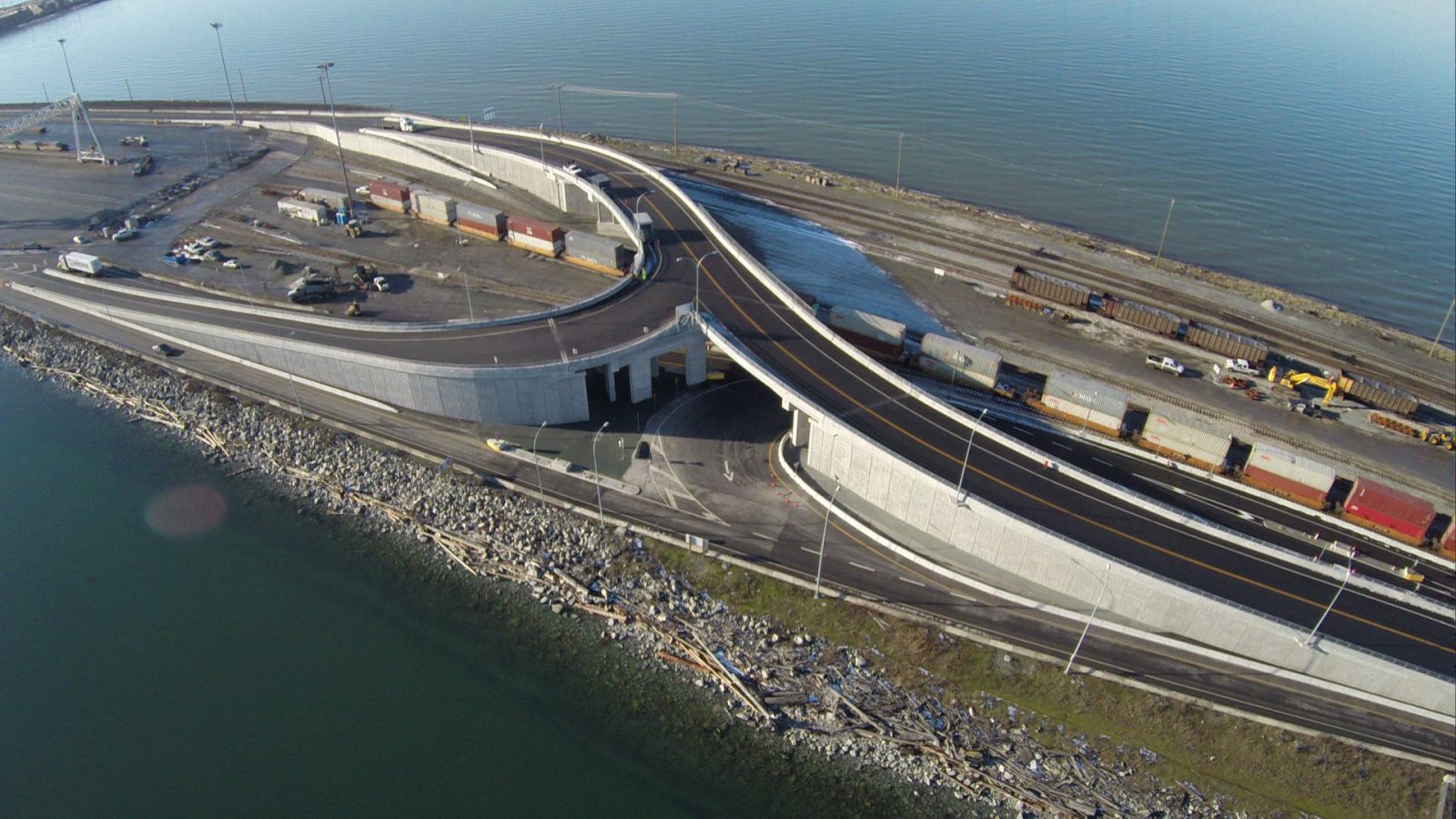 The Deltaport Terminal Road and Rail Improvement Project was a design-build project, constructed by Jacob Bros through a Joint Venture with Dragados Canada. Maintaining continuous road and rail service to the terminal operators at Deltaport during construction was a critical requirement. Scope included the complete design and construction of the railway overpass, approaches and many utility relocates. All of the tracks feeding the container port required carefully-staged realignment to accommodate the new overpass. Several stages of detours were also required to re-route port truck traffic during the various stages of the bridge and approach construction.