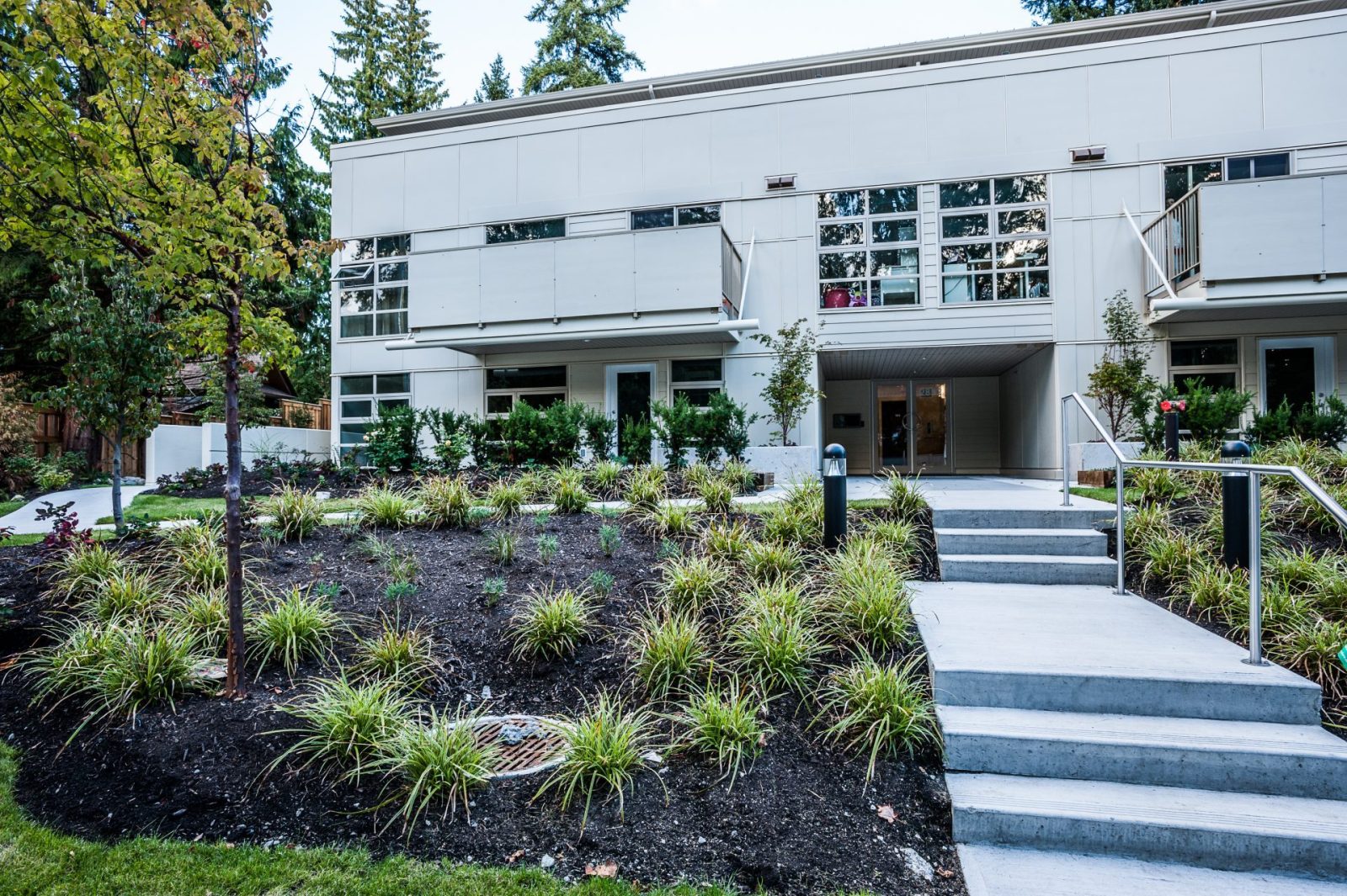 Construction of an three-story wood-frame condominium with an underground parking structure. Jacob Bros functioned as both Owner’s Project Manager and General Contractor to manage the design and construction of this 14 unit executive condominium on Capilano Road in North Vancouver. Framed by the picturesque North Shore mountains, this project is nestled in a heavily wooded area and faced challenging constraints of preserving large trees in close proximity to the underground parking structure. With a gross building area of 17,700ft2, this design-assist project involved unique suite layouts and consciously provided privacy to both the neighbouring houses and each strata unit.