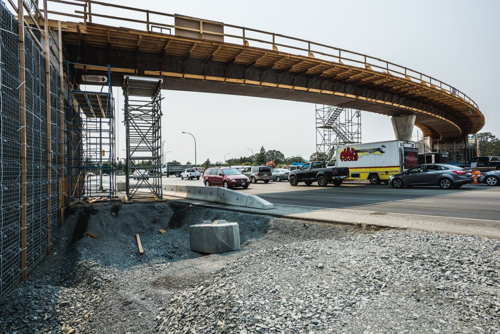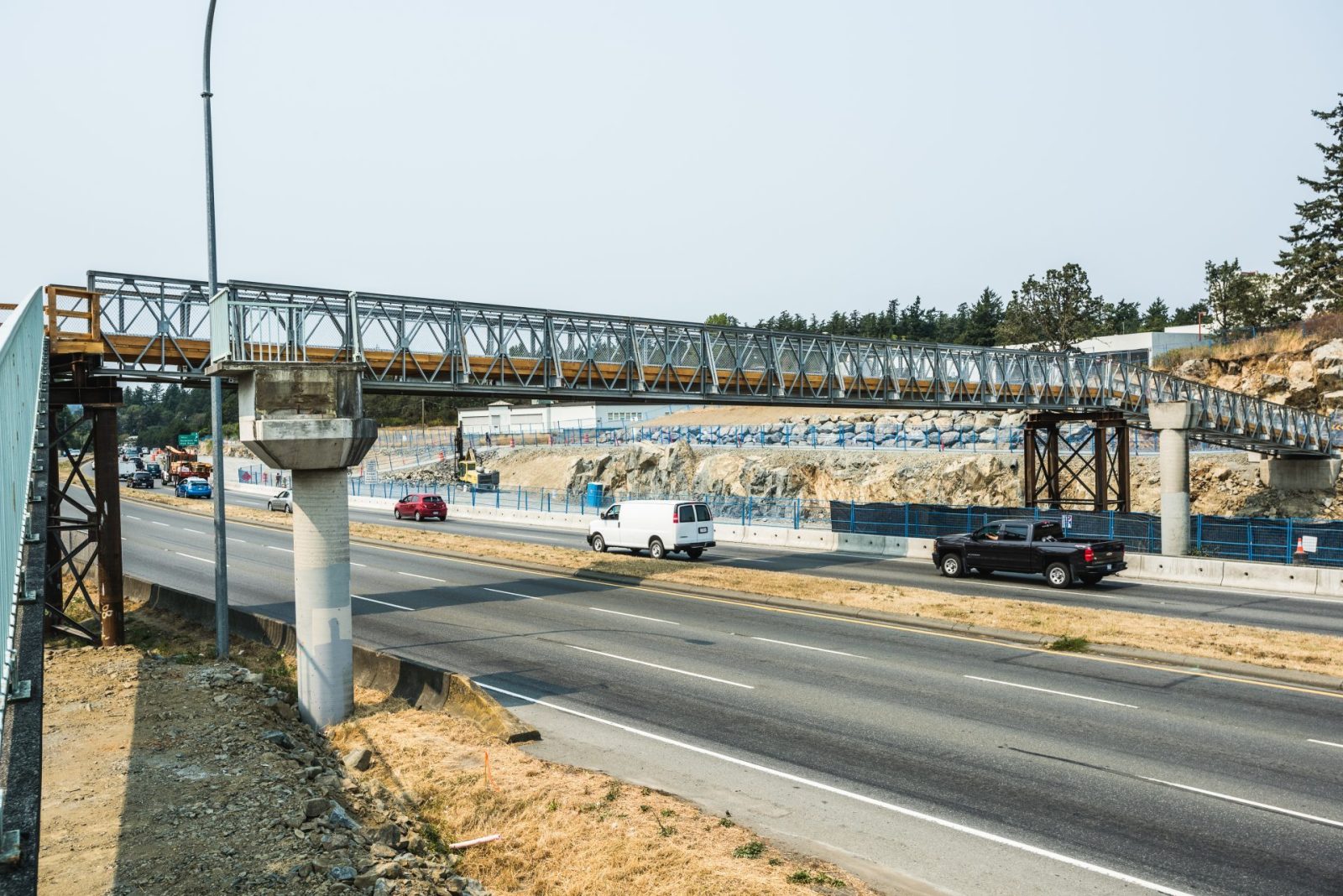 The Admirals / McKenzie Interchange is the busiest intersection on Vancouver Island and as such, traffic control and impact mitigation were key attributes of the project. It included rock excavation, preload fill supply and installation, design and construction of proprietary MSE Walls, demolition of an existing pedestrian overpass and the installation of a temporary pedestrian overpass. The work also included construction of the Galloping Goose Trail overpass, welded steel and PVC water mains including valves and chambers, new asphalt and gravel multi-use pathways, as well as asphalt paving.
