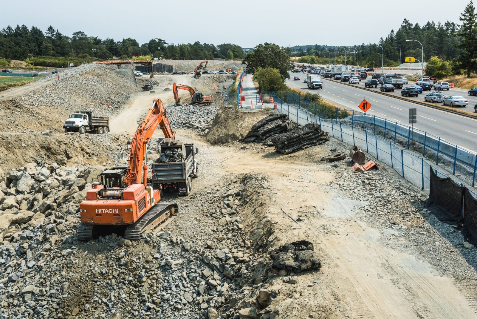 The Admirals / McKenzie Interchange is the busiest intersection on Vancouver Island and as such, traffic control and impact mitigation were key attributes of the project. It included rock excavation, preload fill supply and installation, design and construction of proprietary MSE Walls, demolition of an existing pedestrian overpass and the installation of a temporary pedestrian overpass. The work also included construction of the Galloping Goose Trail overpass, welded steel and PVC water mains including valves and chambers, new asphalt and gravel multi-use pathways, as well as asphalt paving.