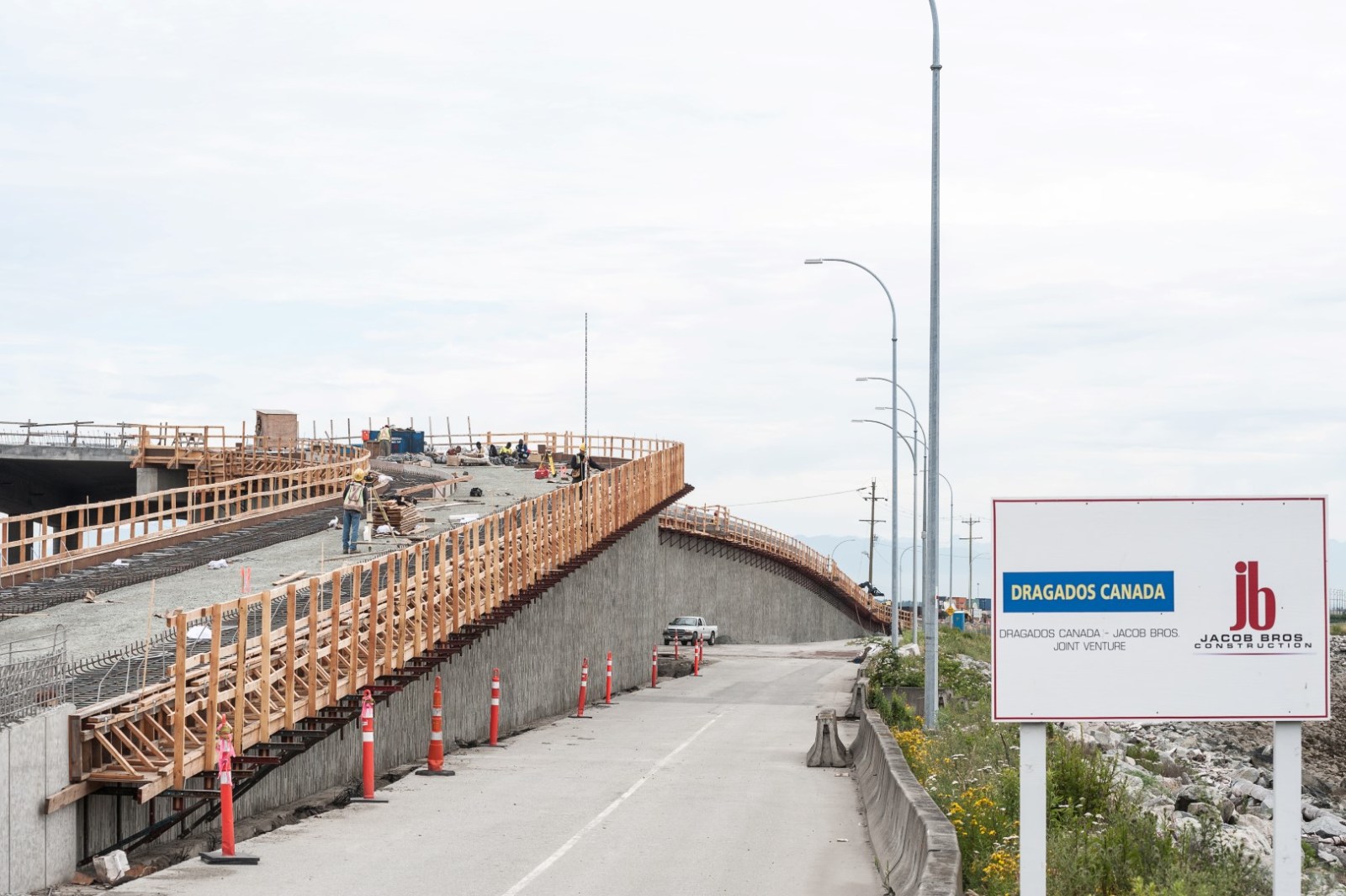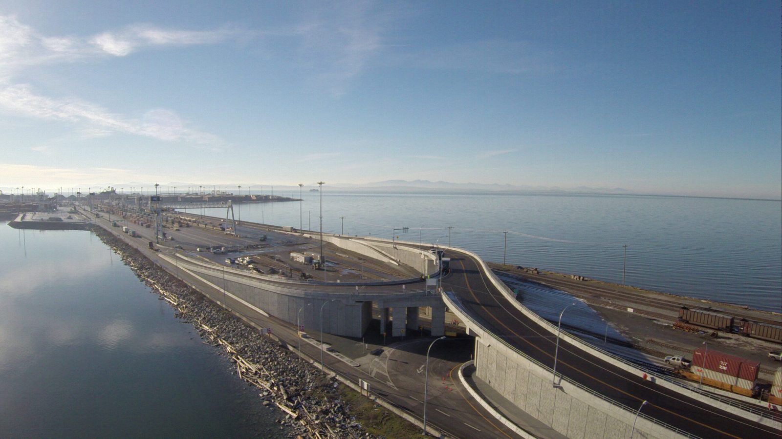 The Deltaport Terminal Road and Rail Improvement Project was a design-build project, constructed in partnership with Dragados Canada Inc. The new causeway overpass separates road and rail traffic, improving the flow of container trucks and trains accessing the terminal, reduces truck and vehicle idling, increases safety and contributes additional capacity annually to Deltaport Terminal operations.